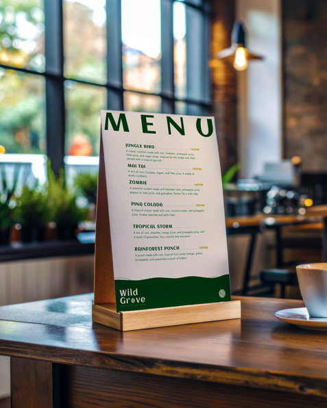 MAHŌ Studio supported Wild Grove in developing its complete visual identity: from the logo, signage, posters, and menus to digital communication on Instagram. The studio also created branded items such as glasses, napkins, shopping bags, staff uniforms, and other customized elements, ensuring an elegant and distinctive consistency in every detail of the guest experience.